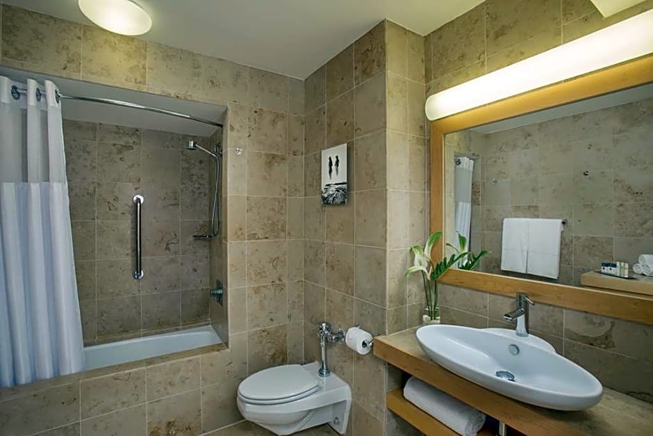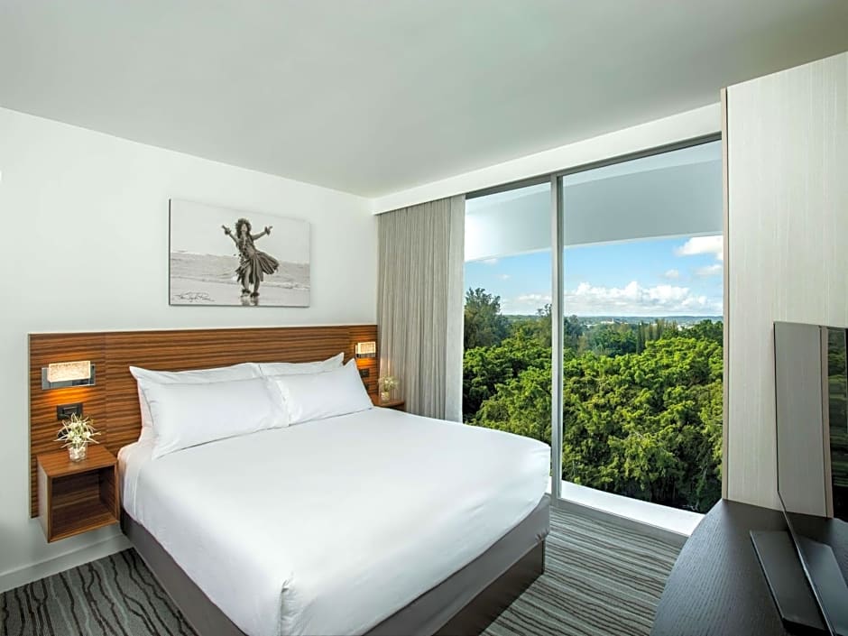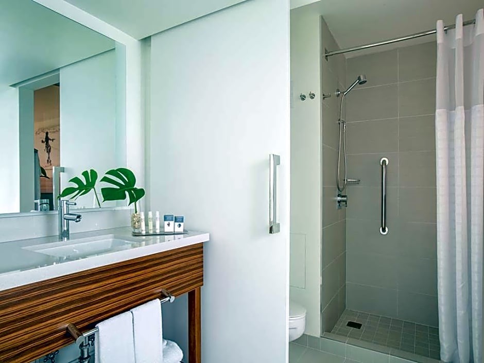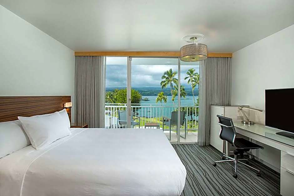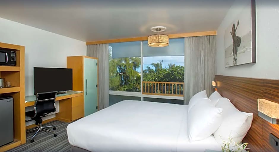This mobility and hearing accessible standard room features one king bed, and an accessible tub. The room also has a visual alarm, and notification devices for the doorbell or door knock and incoming telephone calls. 369 sq. ft. WiFi available, 48-inch HDTV, and alarm clock as well as hairdryer, microwave, mini-frig, in-room safe, Ergonomic Desk Chair, cordless phone and coffeemaker with local coffee flavors. Ocean View Balcony with outdoor seating. Any corresponding photo may not reflect the specific accessible room type or room feature.